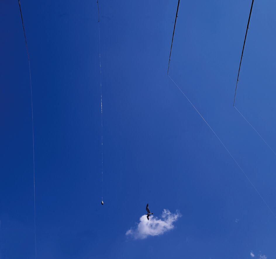 抬头看到天空垂钓的鱼竿,总觉得过于单调,眼前不停飞来飞去的海鸥落入我的视线,他们也在等待捕捉着自己的午餐。这些在水中游弋着的可怜的小鱼们,它们的周围布满诱饵,空中的海鸥等着它们的疏忽。一个念头浮现在我脑海中,让鸟和鱼竿组成一个风景吧!我选择一朵白云为背景,等待快速飞翔的海鸥经过。我渴望海鸥能进入白云的中间,可是并不是都那么如意,这也证实了“理想很丰满,现实很骨感”这句话。